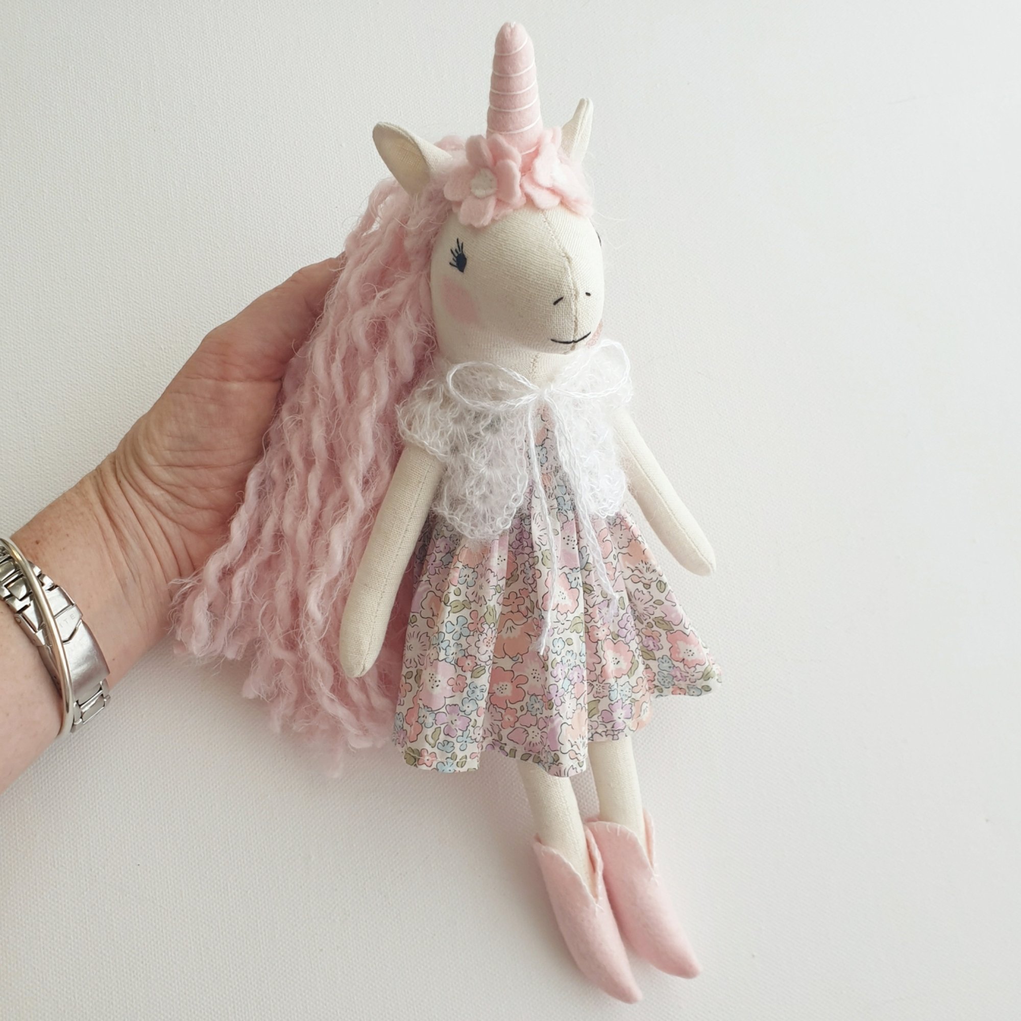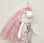 You will be able to make your own sweet unicorn doll from this pattern and tutorial that I have designed and used to make many of my dolls. Follow step by step using the suggested materials and detailed instructions and photos. The dolls body is made from homespun or linen cotton and polyester stuffing. No fancy equipment is needed to make this doll however you will need a sewing machine. Finished doll measures about 11 inches.